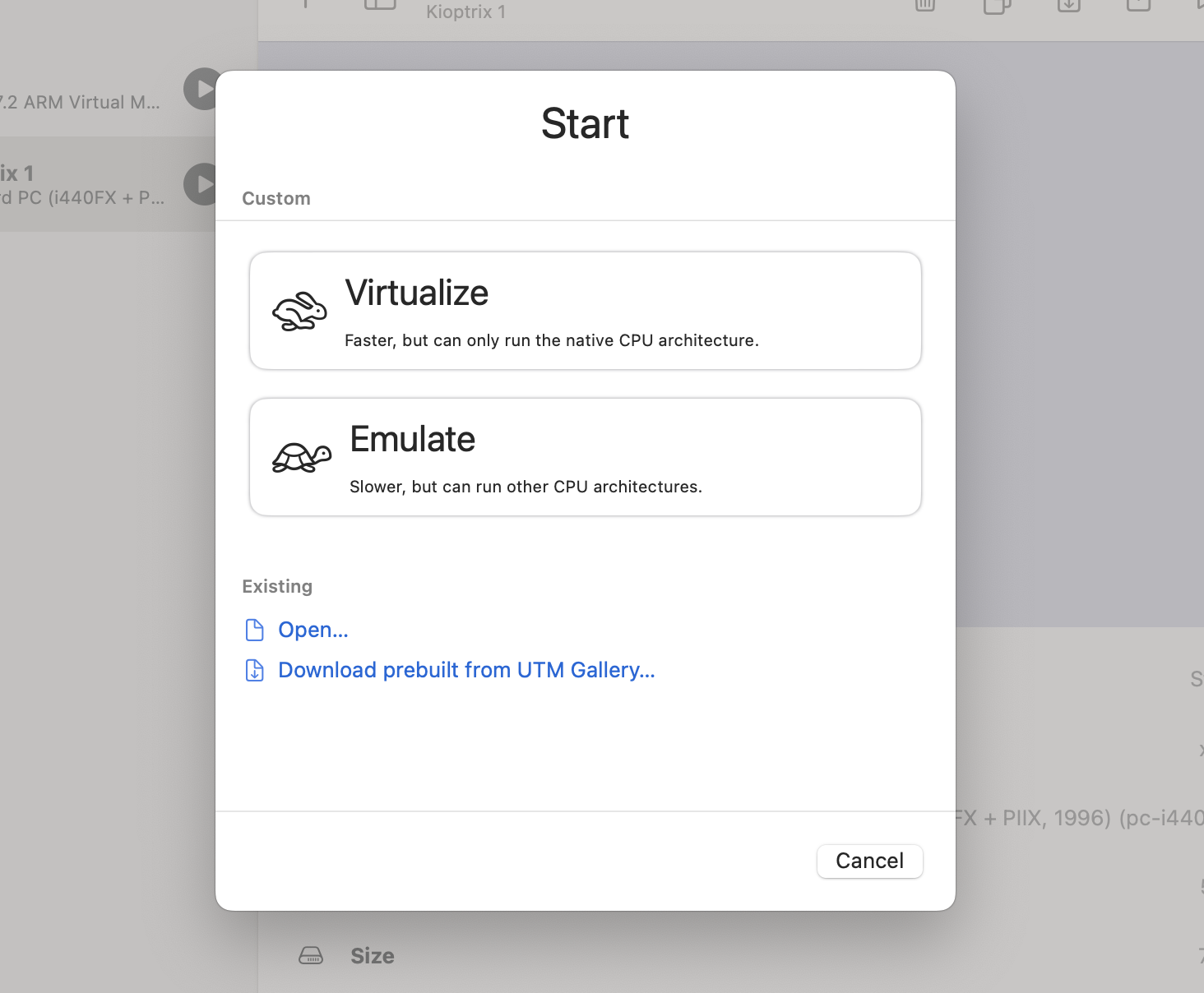Once the download is done, you can start UTM and create a new VM. You will be asked to select whether or not you want to emulate the architecture for the VM. In the case of the same architecture, it is not necessary to emulate