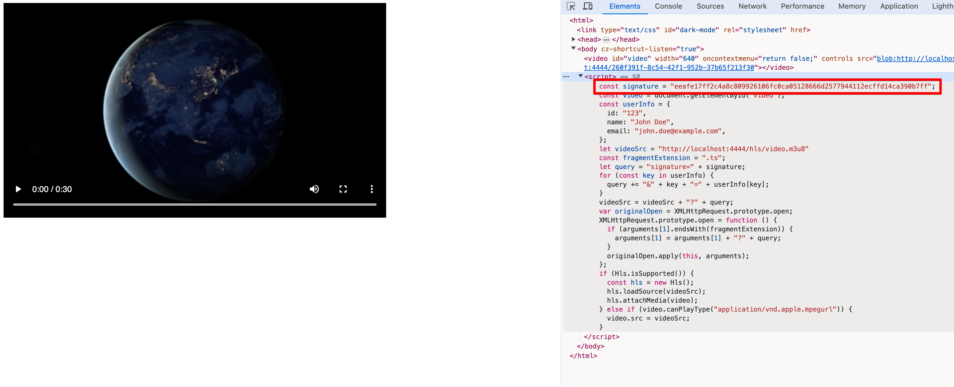 Now comes the interesting part. We need to serve the HTML page that contains the video player by injecting into it the signature that will be used for all subsequent requests. The important thing is that the signature is obtainable the first time only from the HTML page itself.